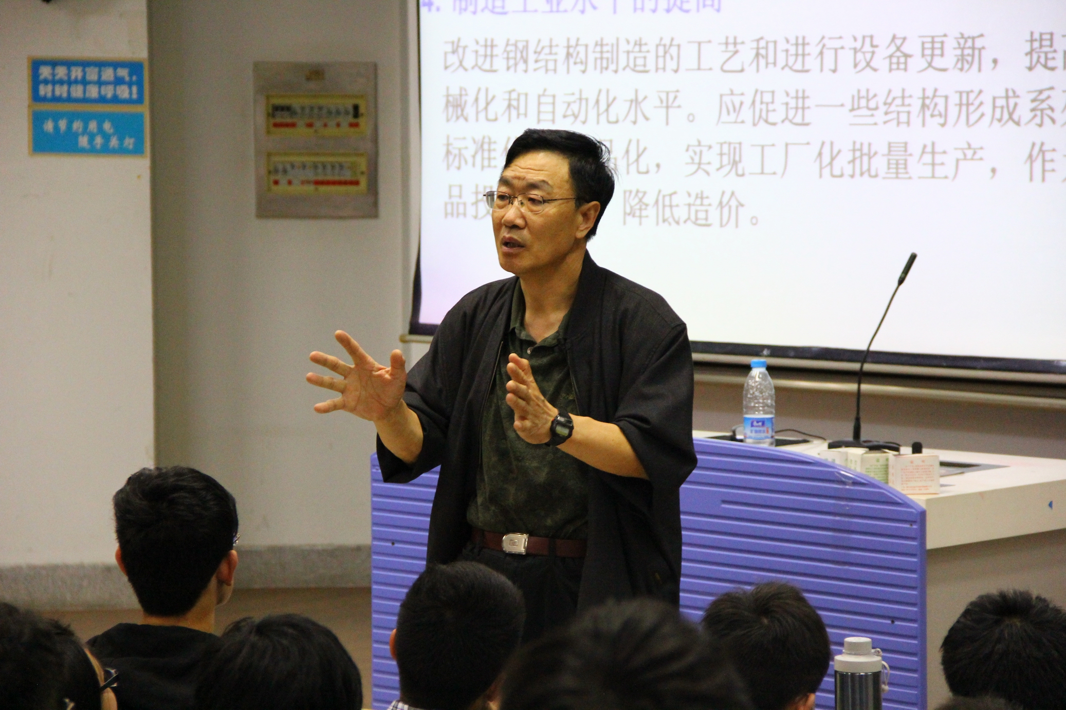 讲座开始时,曹教授首先通过埃菲尔铁塔这一典型钢结构建筑引出本次主题。曹教授从钢结构广泛应用领域、钢材供给充足、钢材物理性能等六个方面分析钢结构发展前景。随后曹教授展示了钢结构在土木工程建筑中的应用实例,并着重讲解大跨度建筑在工业建筑、水利、电力项目中的应用,同时对鸟巢建筑做了详细介绍。曹教授指出未来钢结构发展方向:新型特种钢研发、钢结构设计计算方法革新等,鼓励同学们认真学习。最后,曹教授与学生们进行了互动,解答同学们的疑惑。