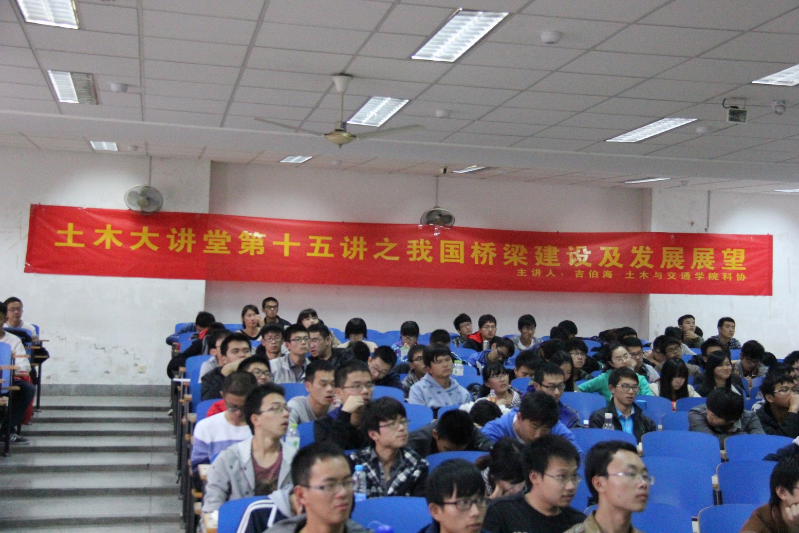 2013年10月29日下午2:00,土木大讲堂第十五讲之“我国的桥梁建设及发展展望”在致用101举行。本次讲座主讲人是桥梁建设研究所的吉伯海教授,土木工程专业大一、大二学生参加。