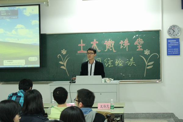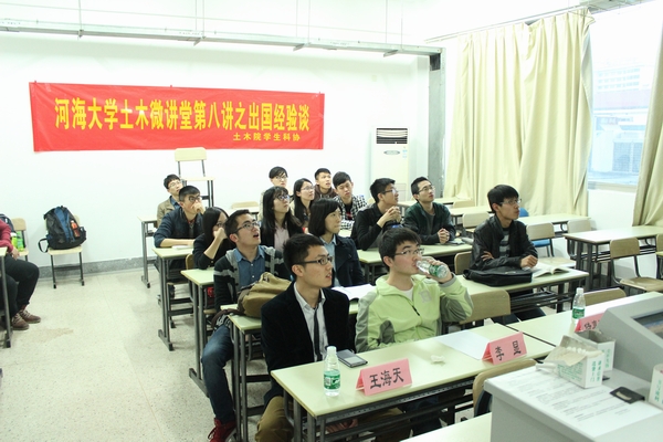 2015年4月21日晚,土木与交通学院“土木微讲堂”第八讲之“出国经验谈”在闻天馆303正式开讲。本次土木微讲堂的主讲人为2011级土木工程专业本科生侍嘉鹏、王海天和李显同学,为有意向出国的同学们传授经验,解决疑惑。