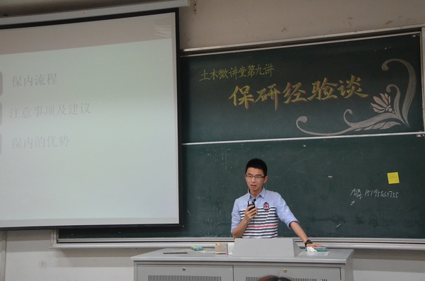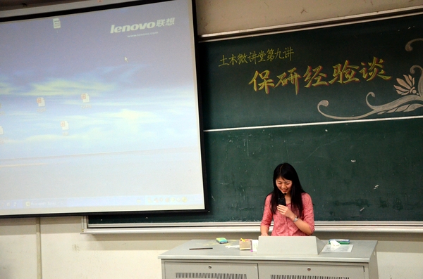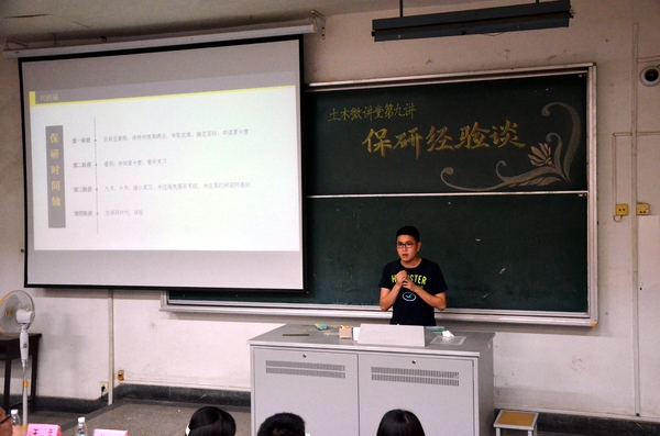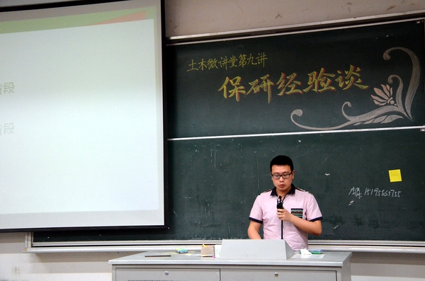 2015年4月28日晚,土木与交通学院“土木微讲堂”第八讲之保研经验谈在北教303正式开讲。本次土木微讲堂的主讲人为土木院2011级本科生马志东、毋佳玉、孔祥明、李倩、曾鹏、王孟。吴昊老师、王璐老师和2012级部分本科生参加了本次讲座。