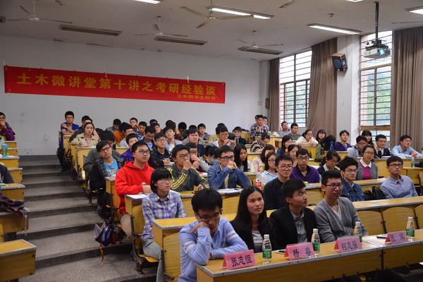 2015年5月11日晚,土木与交通学院“土木微讲堂”第十讲之考研经验谈在北教203正式开讲。本次土木微讲堂的主讲人为2011级土木工程专业张志恒,柯志强、杨睿和张琪,王璐老师和2012级部分本科生参加了本次讲座。