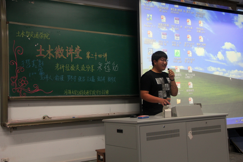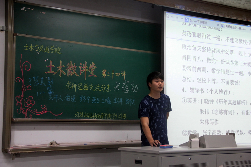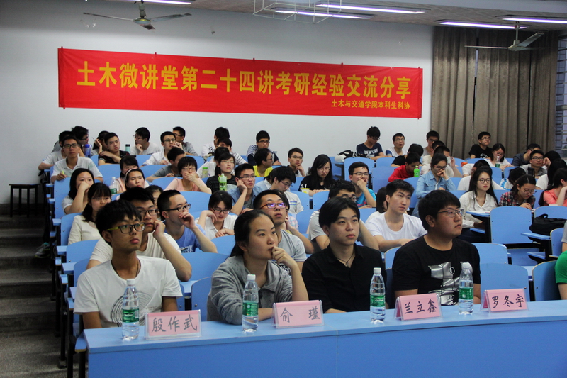 2016年5月30日晚上6:30,土木与交通学院“土木微讲堂”第二十四讲之“考研经验交流分享”在本部管理楼101成功举办。本次微讲堂邀请了2012级土木专业张吕、张志祥、俞瑾、殷作武与交通专业罗冬宇、兰立鑫六位同学作为主讲人,为学院同学们分享自己考研准备过程中的经验。