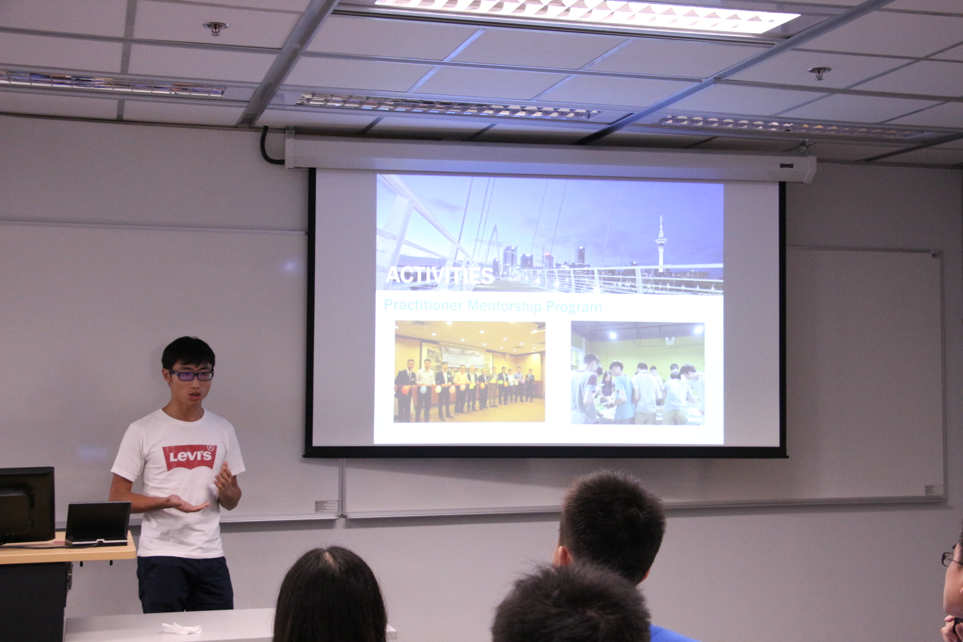 随后ASCE-ISG香港科技大学分会副主席李国轩同学向与会人员分享了香港科技大学分会近一年来所取得的工作成绩。他指出,香港科技大学分会的工作重心体现在社会服务上,即推动社会人士指导学生的职业生涯规划,学生继续服务社会。