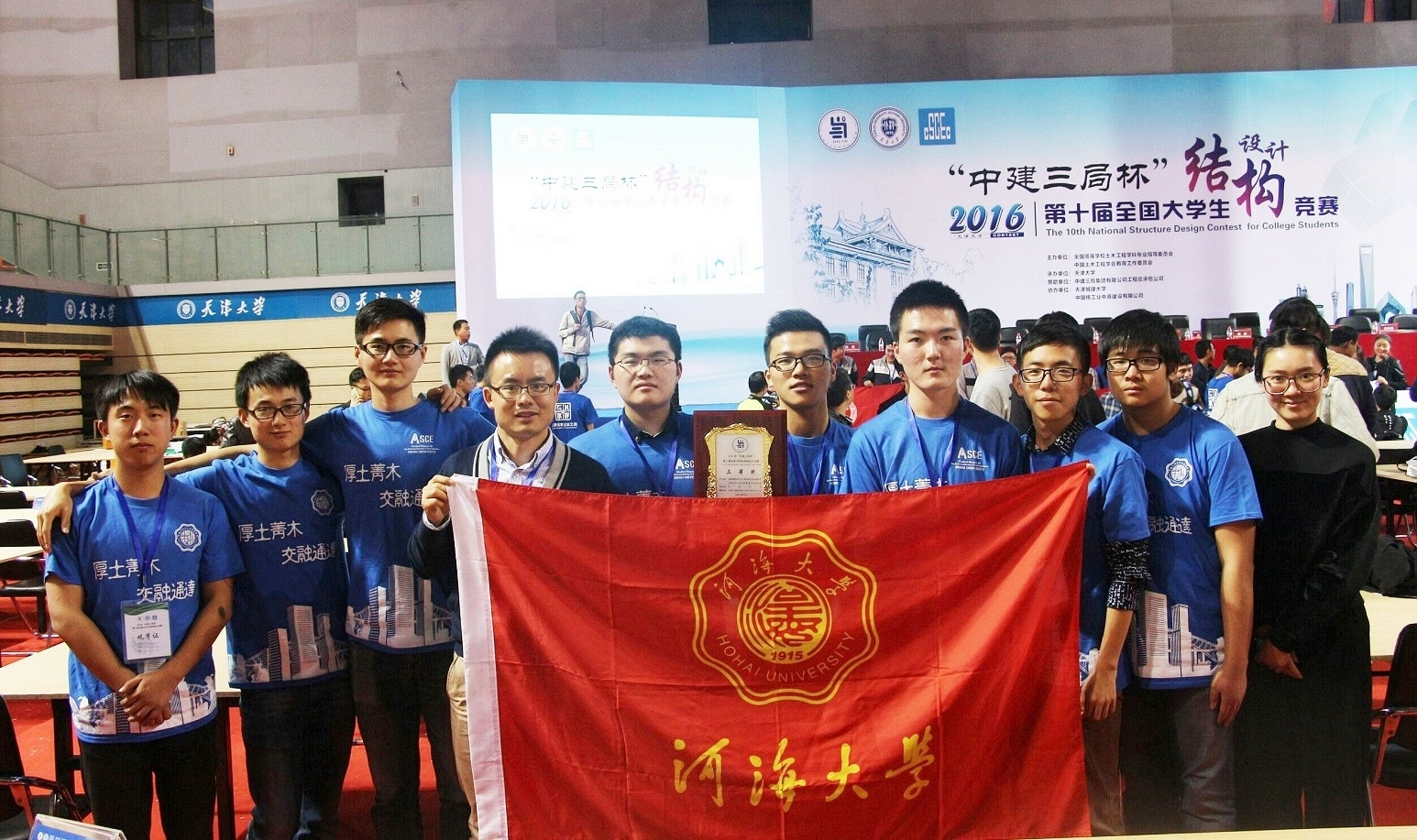 2016年10月12日至10月16日,第十届全国大学生结构设计竞赛在天津大学举行。在学院精心组织和指导教师(喻君)辛勤辅导下,由我院土木工程专业2014级本科生任兆鹏、徐文磊、徐夏佺组成的河海大学代表队喜获三等奖,连续第三年为河海土木专业在此赛中争得荣誉。