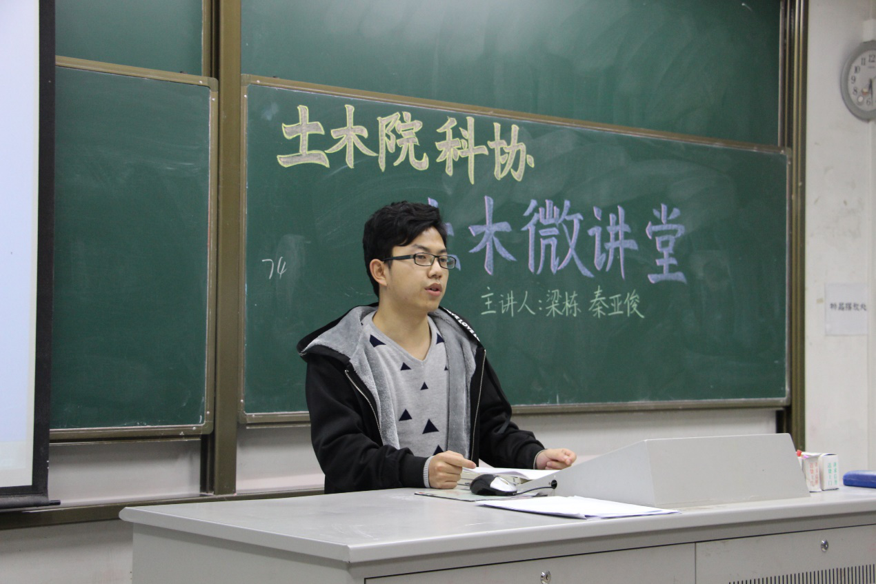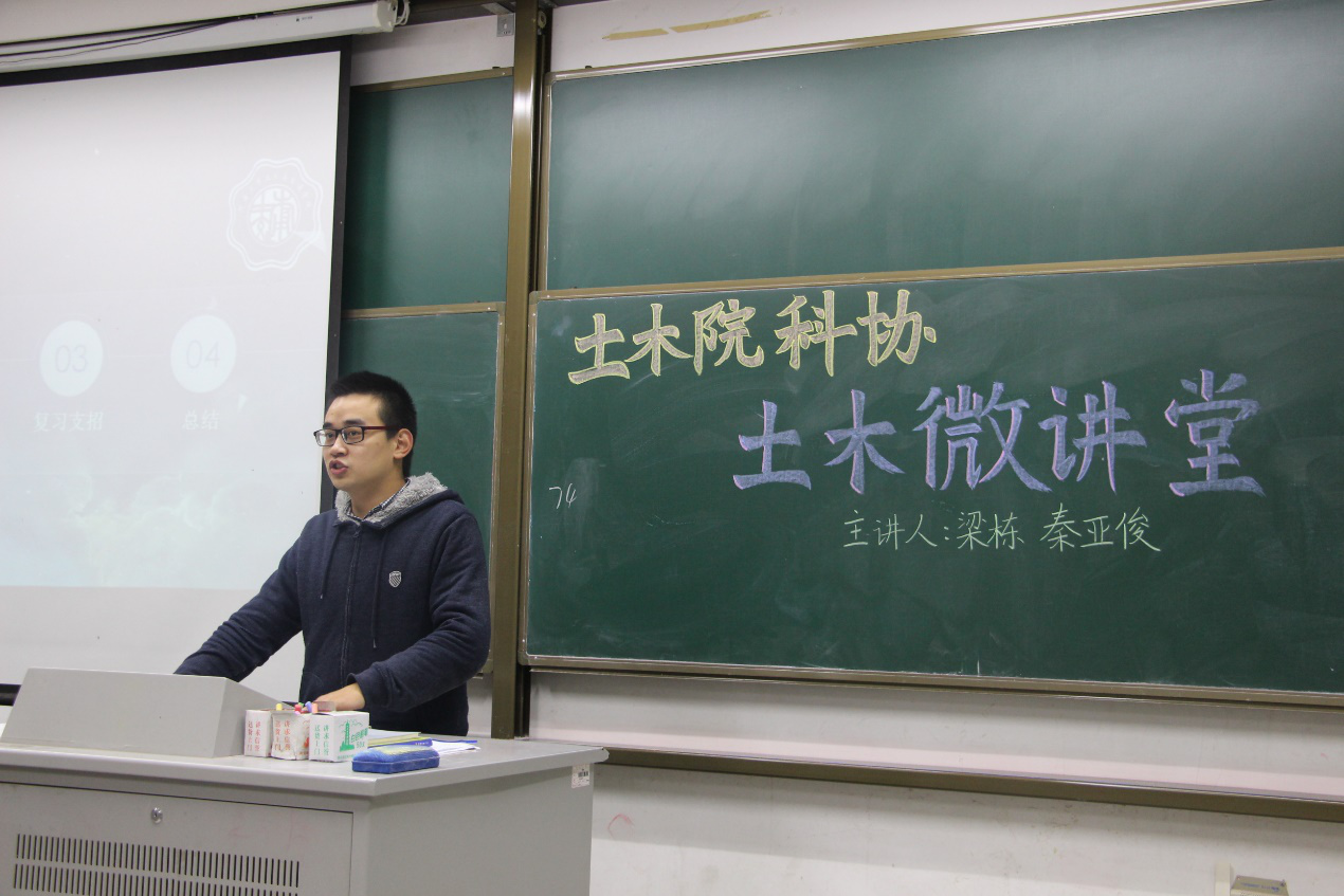 2016年11月22日晚18:30,由土木与交通学院本科生科协承办的土木微讲堂第三十一讲——“理论力学学习方法经验介绍暨2015级赠书仪式”在江宁校区致用楼117举办。本次微讲堂的主讲人是土木与交通学院2014级土木工程梁栋同学和秦亚俊同学。梁栋同学曾任土木院14级年级大班长,现任14级结构二班班长,获得国家奖学金,参加2015-2016年全国大学生先进成图与创新建模竞赛获得建筑类建模一等奖、个人全能二等奖、团体一等奖、创新竞赛一等奖;秦亚俊同学任土木院2014级年级学委,曾获国家奖学金,数学竞赛全国预赛二等奖、江苏省二等奖,数学建模竞赛省三等奖。