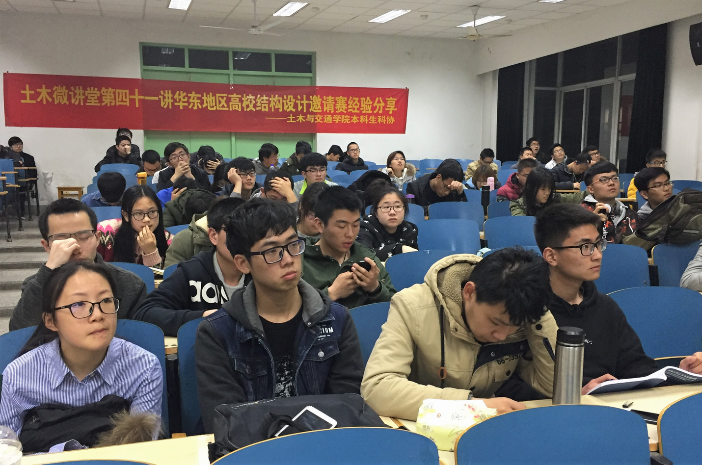 2017年3月18日18点30分,土木与交通学院土木微讲堂第四十一讲之“华东地区结构设计邀请赛经验分享”在江宁校区致用楼317成功举办。本次微讲堂邀请到了12级土木工程优秀本科生罗力中、13级土木工程优秀本科生阚锦照两位同学作为主讲人,为同学们分享他们的参赛经验。