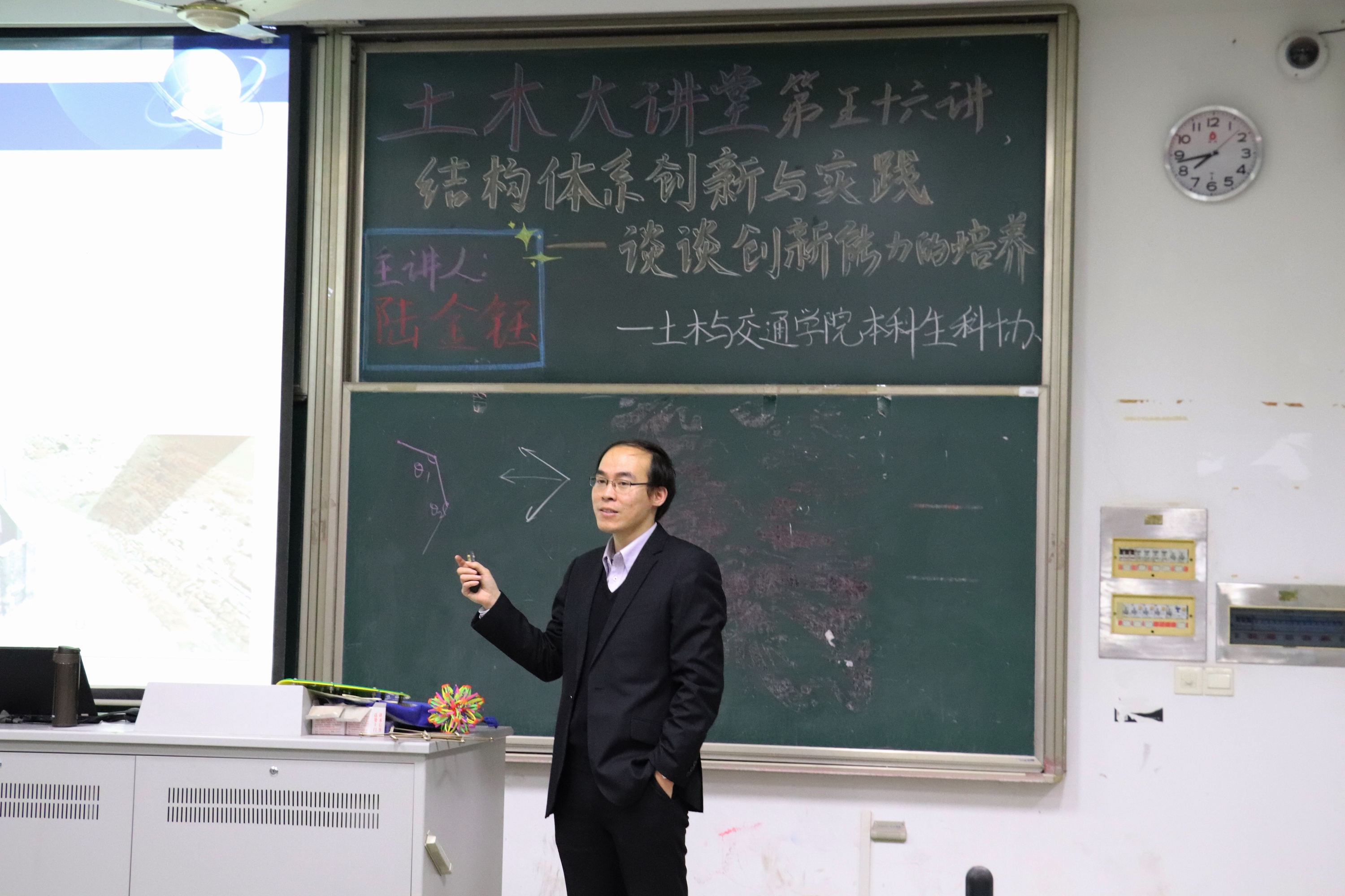 2017年11月20日18:30,由土木与交通学院主办,学院本科生科协承办的土木大讲堂第五十六讲之“结构体系创新与实践——谈谈创新能力的培养”在河海大学江宁校区致高楼B211成功举办。本次大讲堂有幸邀请到了东南大学副教授陆金钰老师作为主讲人,陆金钰老师是美国土木工程师协会(ASCE)会员、国际薄壳与空间结构学会(IASS)会员,主要从事结构方面的研究。太阳集团tyc15115级辅导员王璐老师及部分15、16、17级同学到场聆听了本次讲座。