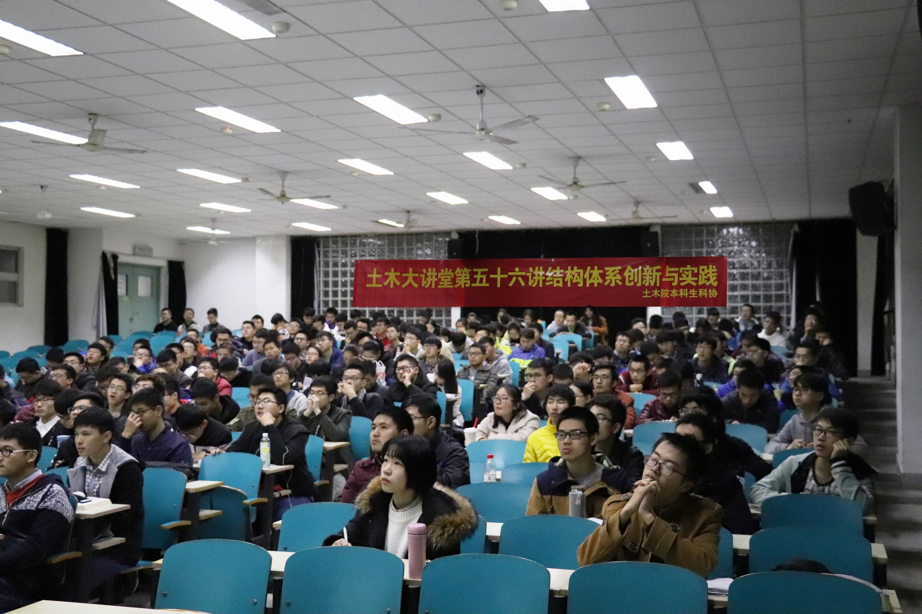 首先,陆教授介绍了东南大学在学生创新培养方面的概况,重点介绍了“课堂导研—课题引研—竞赛拓研—工程强研”四位一体的培养模式和学生组织在创新方面“自主驱动”的运行机制。陆教授还展示了部分学生创新项目的成果,激发了同学们对结构创新的兴趣。
