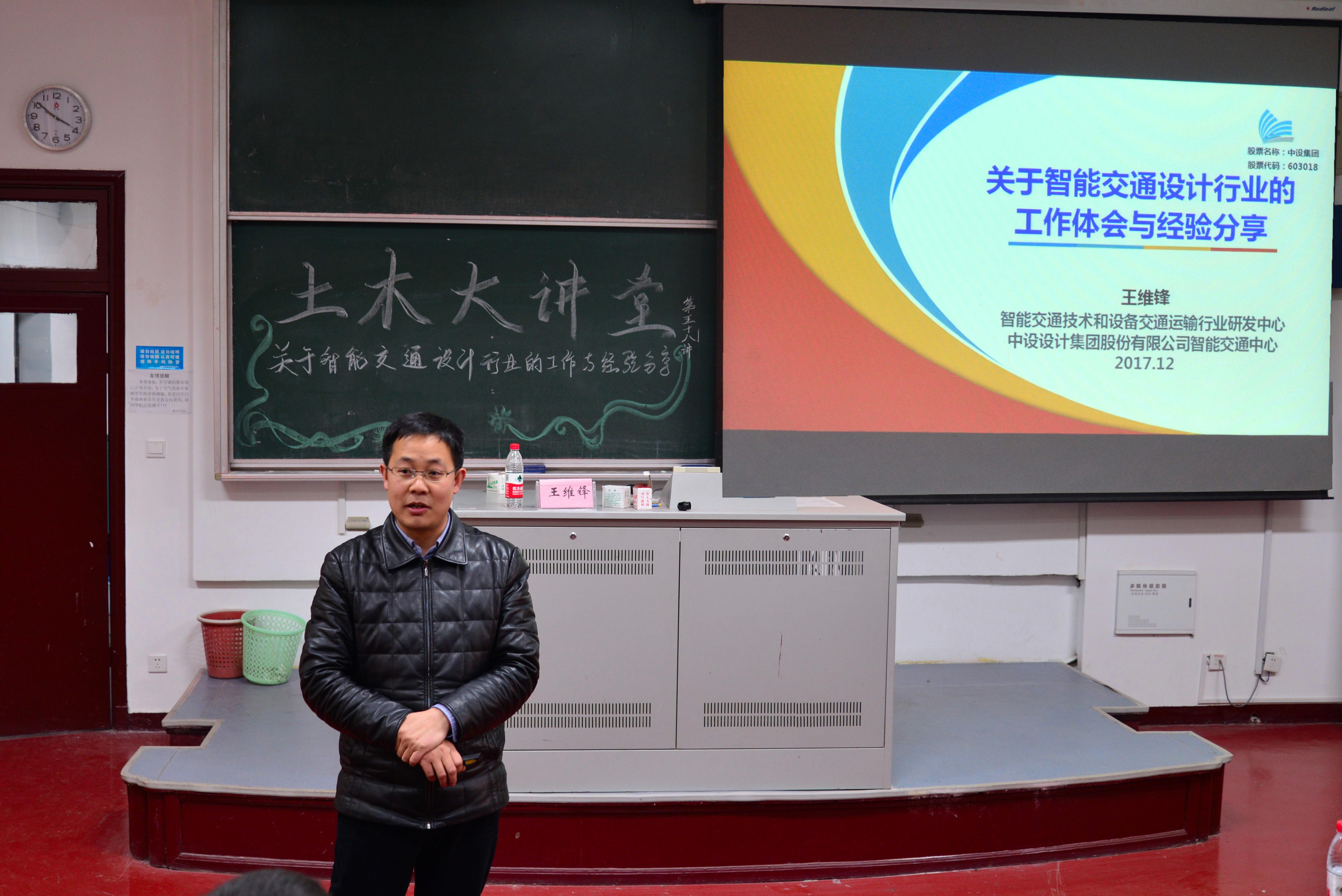 2017年12月11日,由土木与交通学院主办,学院本科生科协承办的土木大讲堂第五十八讲之“关于智能交通设计行业的工作体会与经验分享”在河海大学西康路校区成功举办。本次大讲堂邀请到了王维锋博士作为主讲人,王博士是现任交通运输部智能交通技术和设备交通运输行业研发中心常务副主任、中设集团智能交通设计研究中心主任,在智能交通设计领域有着丰富的经验。土木院沈扬副院长、交通系李锐副主任出席了本次讲座,2014级、2015级交通专业同学聆听了本次讲座。