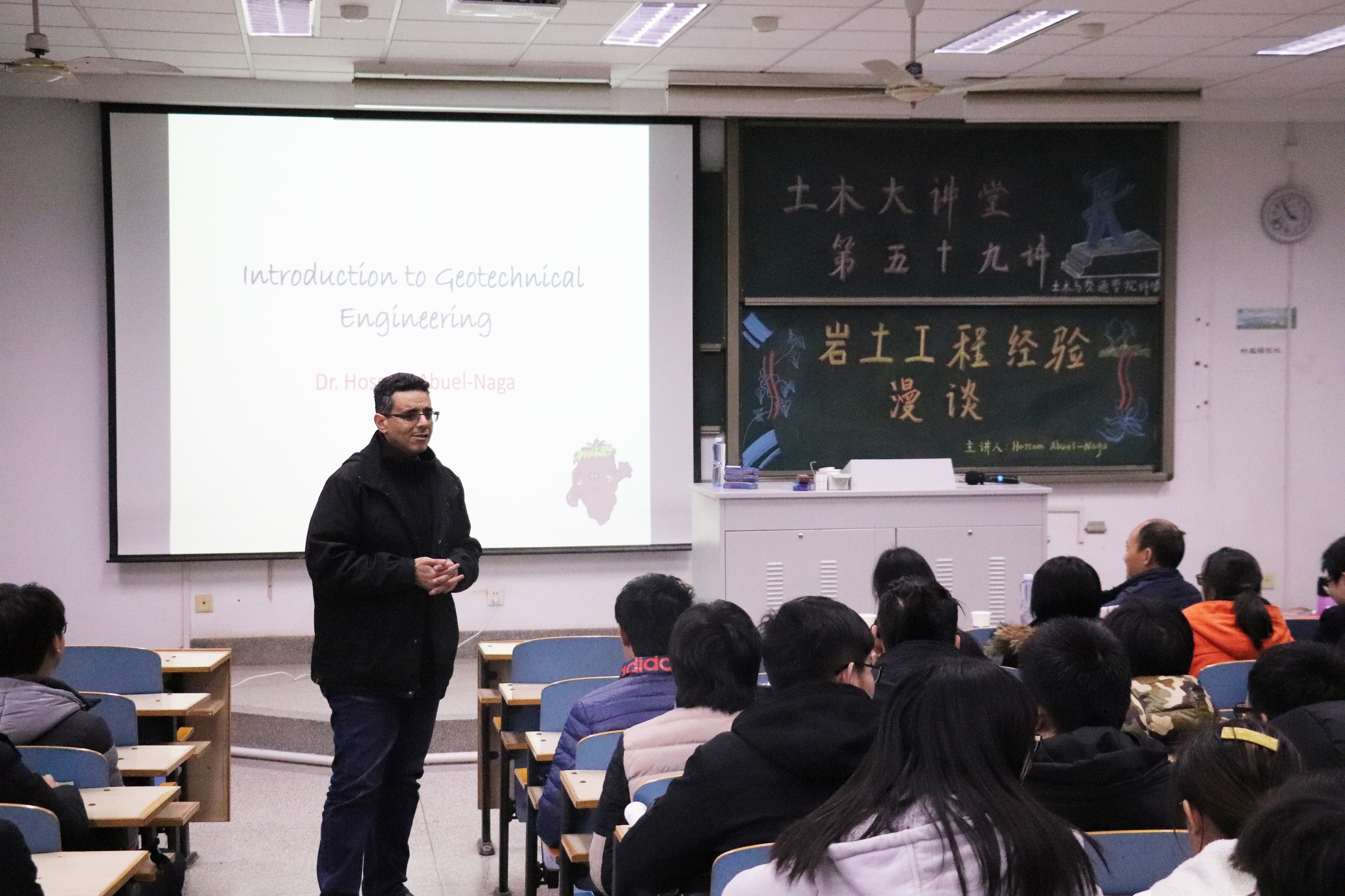 2017年12月13日下午,由土木与交通学院主办,学院本科生科协承办的土木大讲堂第五十九讲之“岩土工程经验漫谈”于河海大学江宁校区致用楼617成功举办。本次大讲堂有幸邀请到了澳大利亚拉筹伯大学土木工程系副教授、土木工程系主任Hossam Abuel-Naga博士为大家做讲座。太阳集团tyc151博士生导师孔纲强教授主持了本次讲堂。土木与交通学院2016级辅导员陈明明老师与2016级全体本科生到场聆听了本次讲座。