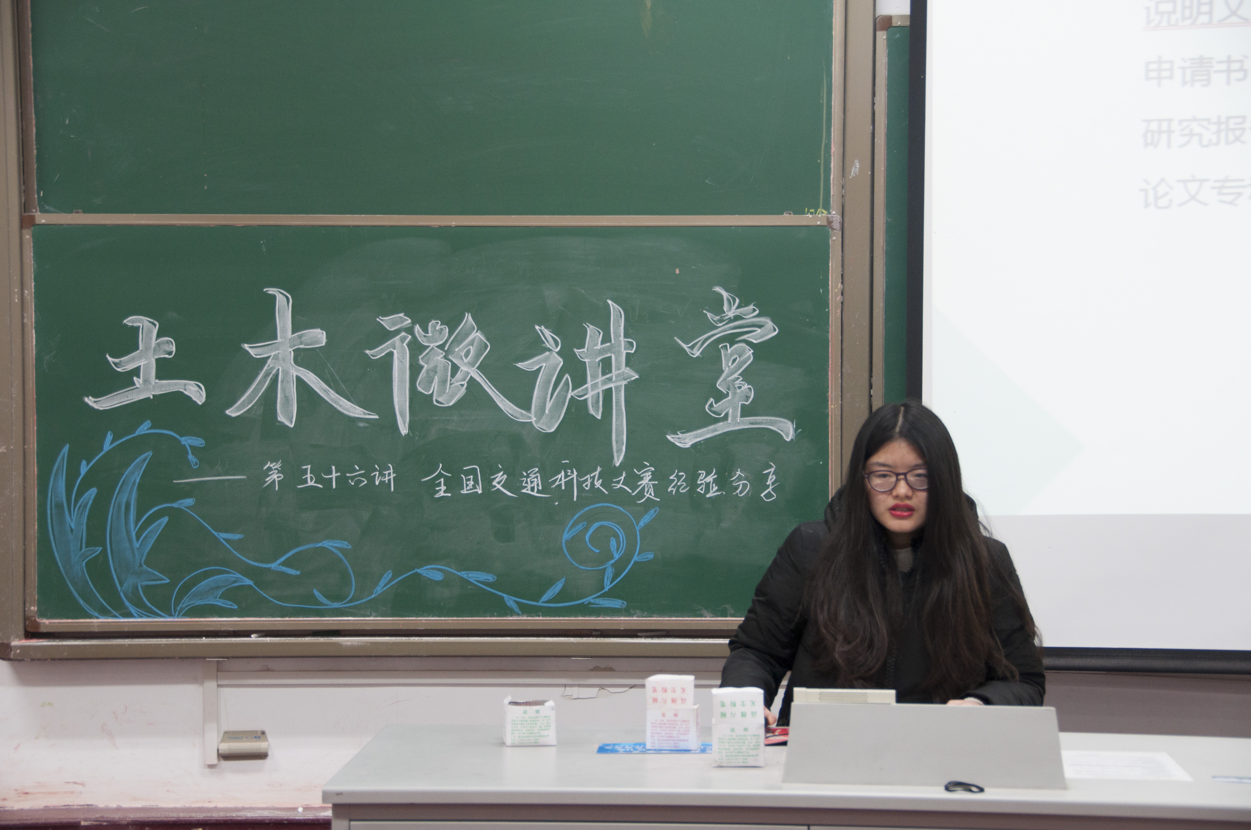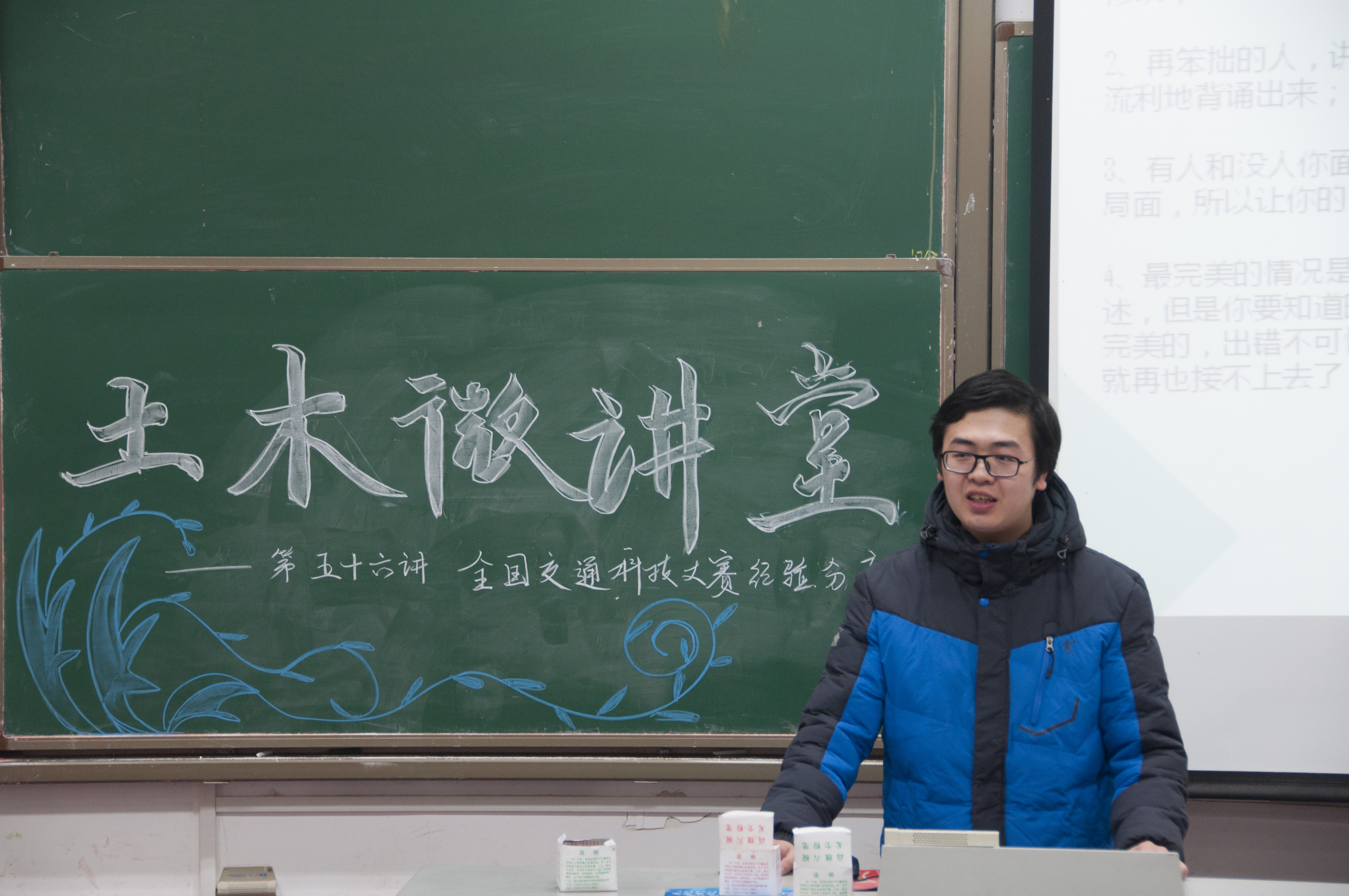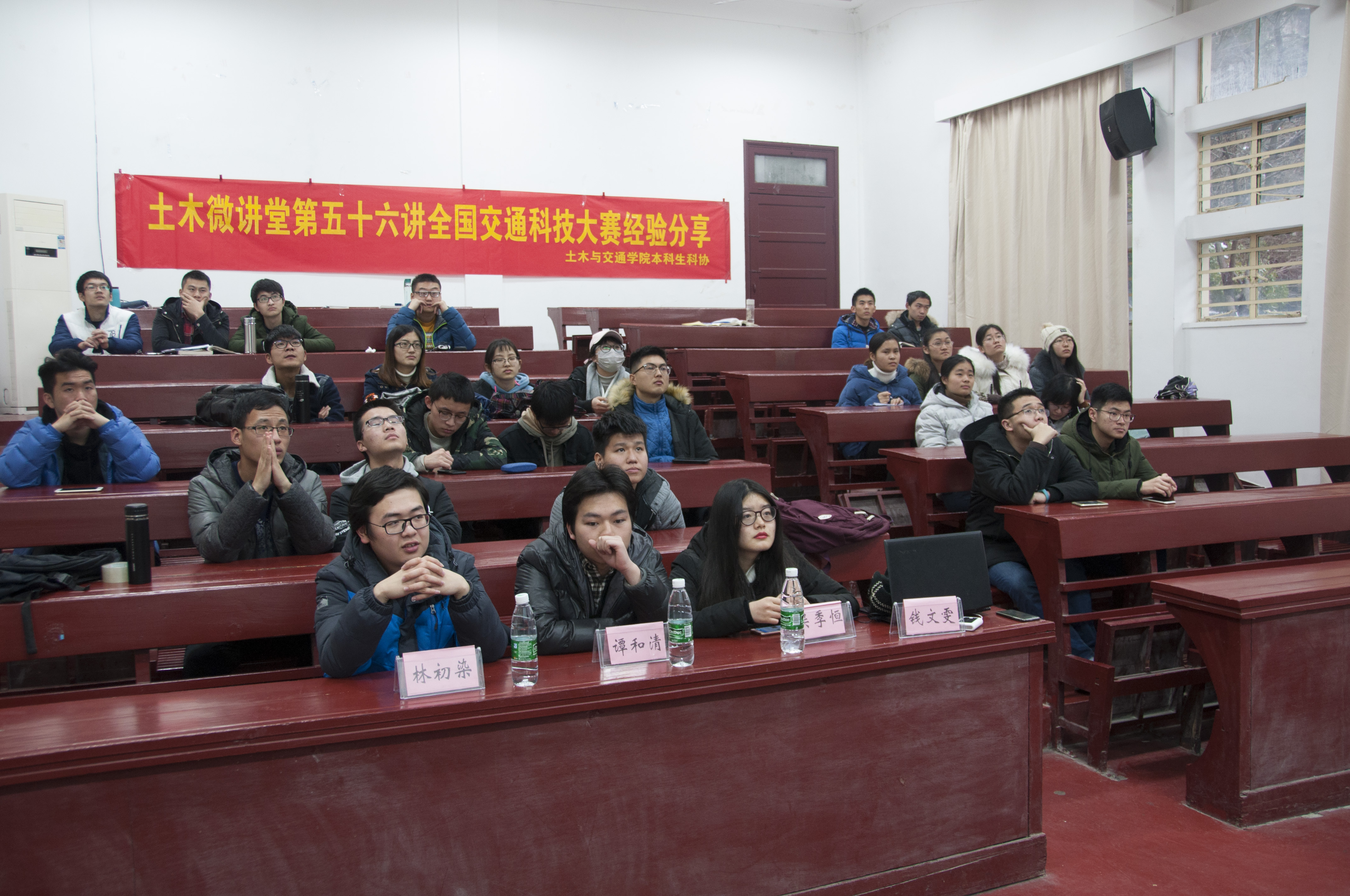 2018年1月6日下午3:50,由土木与交通学院主办,学院本科生科协承办的土木微讲堂第五十六讲之“全国交通科技大赛经验分享”在校本部工程馆101室成功举办。本次讲座邀请到了2014级优秀学生钱文雯、吴季恒、谭和清和林初染四位同学担任主讲人,四位同学来自同一个队伍已经参加并获得了全国交通科技大赛一等奖的优异成绩,对交通科技大赛的备赛、参赛情况有着丰富的经验。土木院2015级的部分同学聆听了本次讲座。