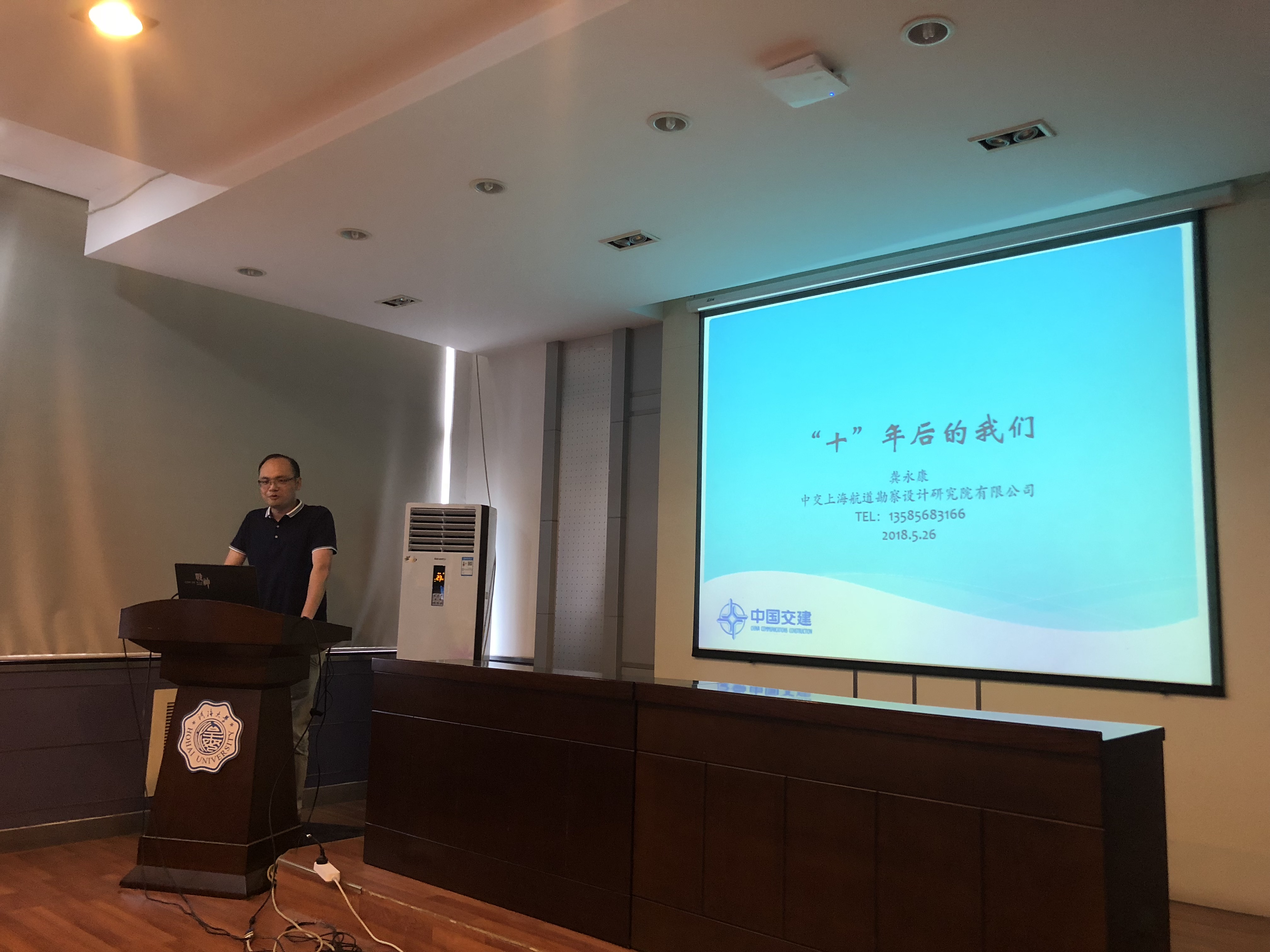 2018年5月26日下午14:30分,主会场活动正式开始,六位校友依次分享自己学生时代和工作阶段的感触和经验。来自中交上海航道勘察设计研究院有限公司的龚永康校友首先开始了他的分享《“十”年后的我们》,他通过一组照片介绍了目前自己的集团及公司的具体工作内容,其次他对自己从“学生党”到“上班狗“这段历程进行讲述。他建议同学们在思考工作问题时,一定要从自身实际出发、提前规划;在工作中,责任心是最被看重的品质。来自中建八局东北公司的张可心校友,以时间线的形式带领同学们走进他的大学和工作生活,他感慨自己在大一大二过得恍恍惚惚,在大三时进入迷茫期,但最终以“专注+行动”,收获了踏实的成果;他将建筑施工行业简洁地概括为“人机料法环”,并深入这五点一一展开。