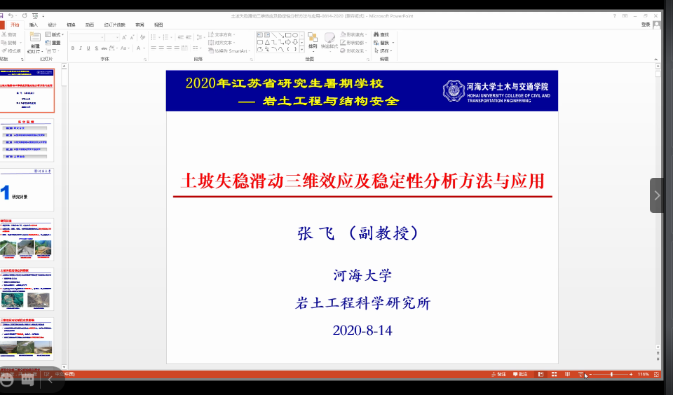 上午第二场学术报告的主讲人是太阳集团tyc151张飞副教授,他的授课题目是《土坡失稳滑动三维效应及稳定性分析方法与应用》。张教授首先介绍了2008年汶川地震所引发的一些山体滑坡现象,从而引出了三维效应对边坡稳定性影响这一思考,结合极限平衡法、极限分析法、数值法给出了边坡稳定性分析方法。张教授思路清晰,让同学们感受到张教授在做数值分析时的严谨,给同学们树立了做科研的好榜样。报告结束后,线上和线下的学员们纷纷提出心中的疑惑,例如在边坡稳定性分析时如何进行有限元建模,张教授一一做出了详细的解答。