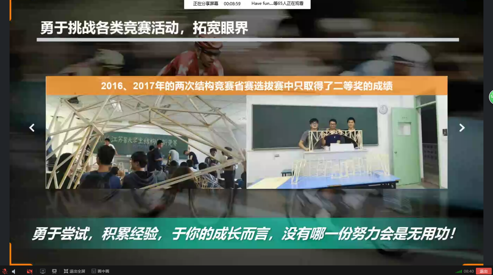 接下来,陈世壮同学从四个方面向同学们分享了自己的生活和学习经验。首先,陈世壮同学强调了课内专业知识的学习。对于基础学科的学习,需要同学们在枯燥中寻找学习规律,并以高等数学和计算机语言为例,讲述了自己的学习方法和技巧。而对于专业知识的学习,需要同学们在实践中思考学习方法,并通过介绍自己在经典力学和工程力学两类专业知识上的学习方法,提供给同学们很多有用的建议。随后,陈世壮同学从基础学科竞赛和专业类竞赛两个方面,介绍了竞赛的种类。并且告诉同学们要结合自身实际,理性地选择并参加适合自己的学科竞赛。之后,陈世壮同学向同学们展示了创训与专利以及科技竞赛的成果,鼓励同学们参与科研课题。陈世壮同学还分享了自己的保研经历,同时向同学们介绍了各个高校土木专业的特色和保研细节,给同学们的生涯职业规划提供了很大的帮助。