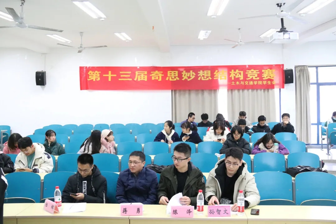 2020年11月28日至29日,由土木与交通学院学生会主办的第十三届“奇思妙想”结构设计竞赛初赛在河海大学江宁校区勤学楼5112顺利举行。本次比赛有幸邀请到了土木与交通学院结构工程研究所蒋勇老师,17级优秀本科生郭方舟、王昊康、陈泽、陆辉、孙智文同学作为本次比赛的评委。来自各学院的共59支队伍参加了本次比赛。
