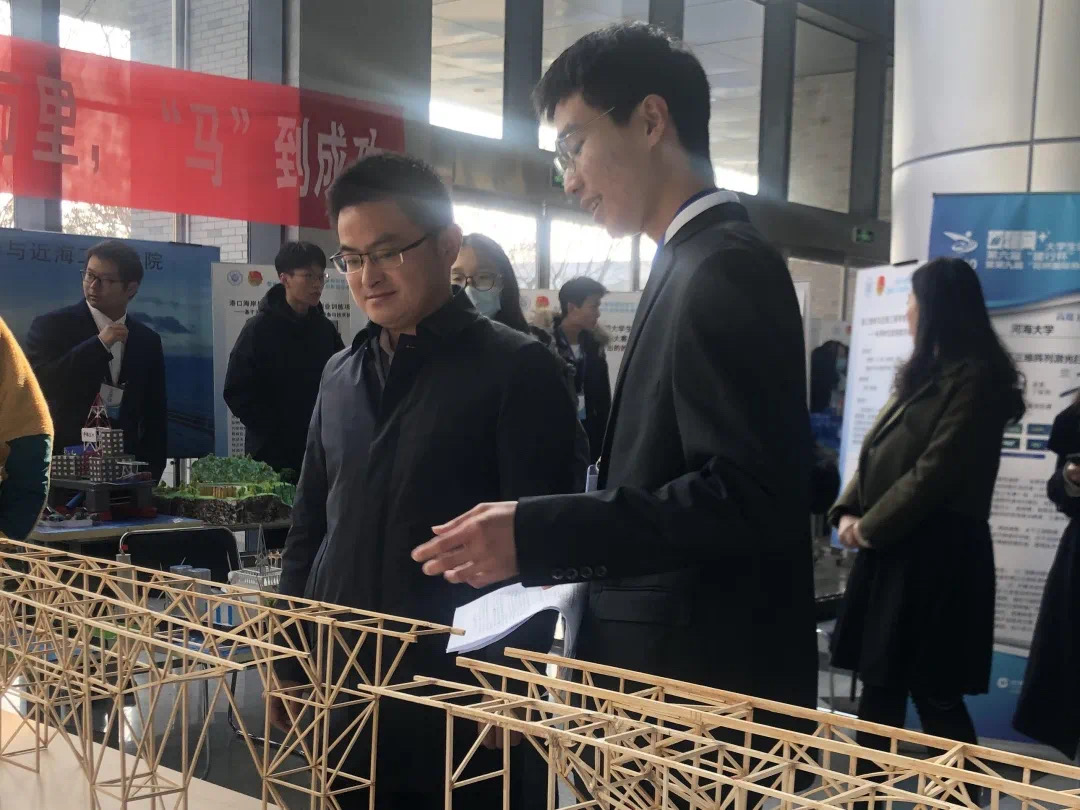 在土木与交通学院的展示台上,展出了我院学子在第十三届“奇思妙想”结构设计竞赛中的四组获奖作品,河海大学团委副书记朱乔到我院展台参观,志愿讲解员为朱书记和在场同学介绍了获奖模型的设计理念以及受力原理。前来参观的同学都为木桥的自重之轻以及承重之大赞叹不已。