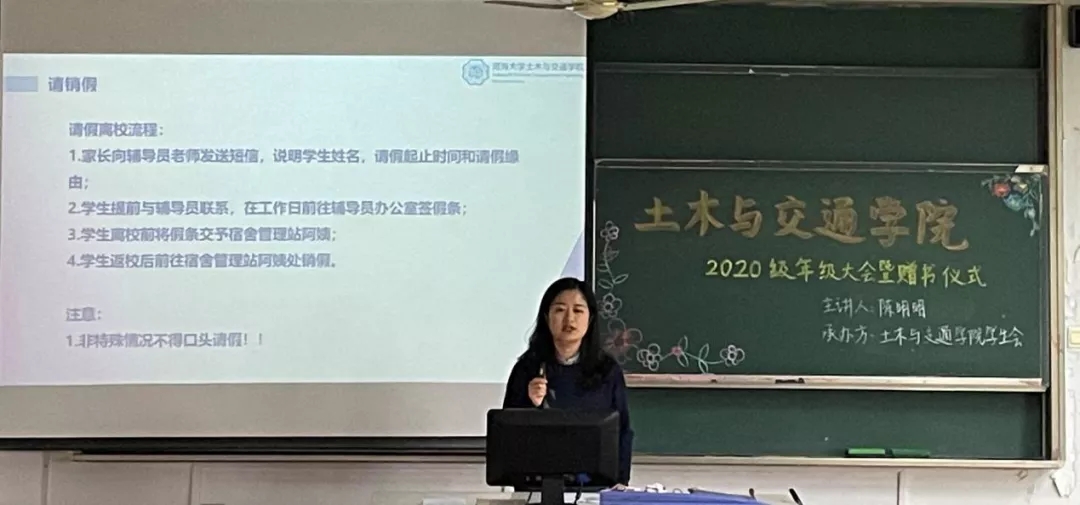 2021年4月16日16:45,土木与交通学院2020级年级大会暨赠书仪式在河海大学江宁校区致高楼B201成功举办。本次大会由2020级辅导员陈明明老师主持,土木与交通学院2020级全体本科生参加。
