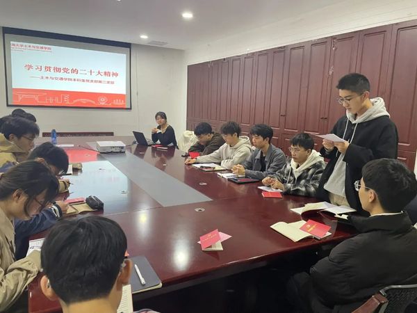 2022年11月15日18:30,土木与交通学院本科生党支部第二支部于西康路校区科学馆407举办深入学习贯彻党的二十大精神主题党日活动。本次活动由支部书记李倩老师主持,支部全体党员到场聆听学习。