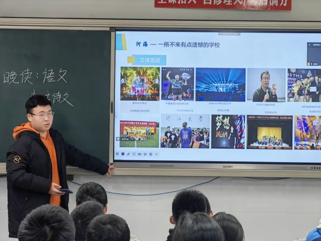 团队成员进行了简单的自我介绍,讲述了自己高中时的经历并分享了学习经验。随后,队长陈宇向高三学子们介绍了河海大学,从河海大学的历史谈到河海大学的未来,介绍了河海大学的强势专业——水利等相关专业,并向同学们分享了河海大学毕业生的就业率及就业去向。最后,团队成员各自介绍了所学专业,讲述了自己对本专业的理解,鼓励同学们积极报考河海大学。