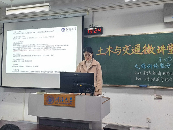 2023年3月17日19:00,由土木与交通学院主办,学院本科生学生会承办的土木与交通微讲堂第一百零五讲之“保研经验分享”于河海大学西康路校区工程馆207成功举办。本次微讲堂有幸邀请到土木与交通学院2019级土木工程专业本科生薛小萌、杨梓林、2019级交通工程专业本科生梁宁晨、华翊璇担任主讲人,土木与交通学院2020级部分学生聆听了本次讲座。