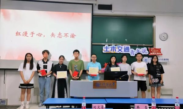 在演讲结束后,土木与交通学院团委江宁负责人韩雪和青年发展部副部长覃小容为七位主讲人颁发荣誉证书并赠送精美礼品。