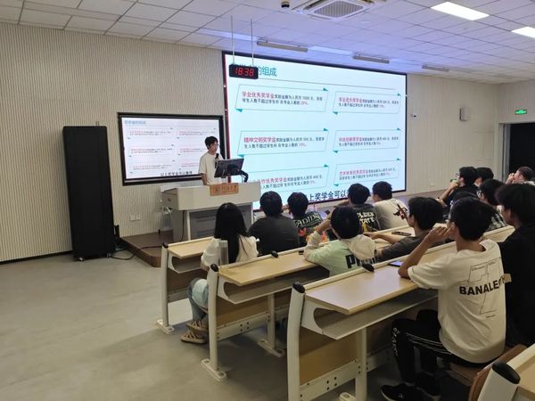 随后,土木与交通学院2023级辅导员助理杨铖光同学上台介绍关于奖学金以及个人荣誉评选的相关事宜。杨铖光同学结合ppt,从奖学金种类、组成、申报要求以及申报材料等方面具体讲解,让同学们细致了解了奖学金申报的整个流程。