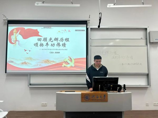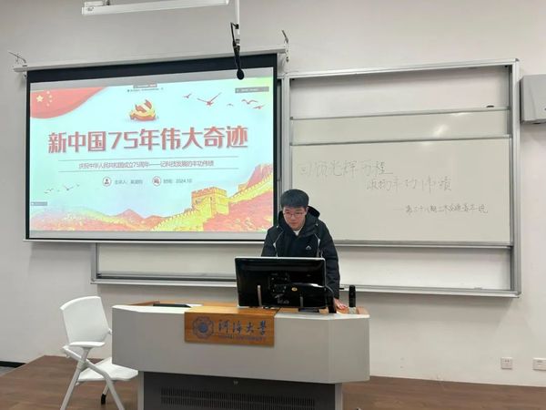 随后,主讲人彭理佳同学系统性地从政治、经济、社会、文化等领域讲述了新中国成立75周年来的辉煌成就。他首先用一个视频为引子,让同学们对于中国这75周年来的发展成就有了整体的认识。接着他针对国家发展的具体成就展开述说,从法治建设到社保体系建设、从经济政策到工程建设、从教育建设到文化传承,无不让同学们感受到如今中国的蒸蒸日上,激励着同学们努力学习为国奋斗。