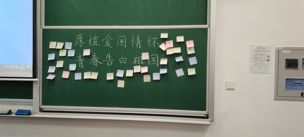 最后,交通二班团支部书记冯卿燕同学组织大家写下对祖国的祝福,团员们将自己内心深处对祖国的美好祝愿在笔尖写下,一行行饱含热情与期望的文字并排粘贴在黑板上。