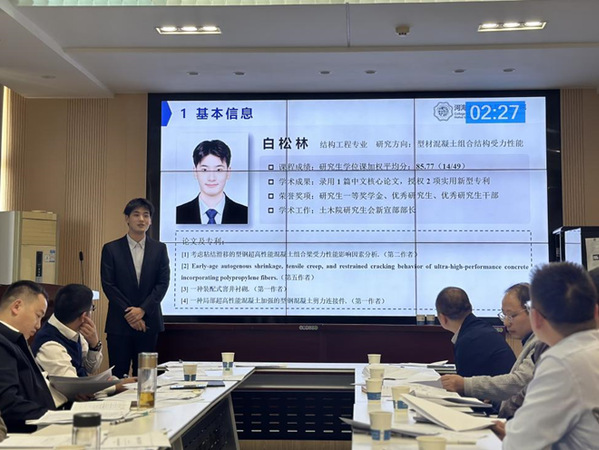 经过层层筛选,11名博士研究生和38名硕士研究生入围本次研究生国家奖学金答辩。答辩分为PPT汇报陈述和评委提问两部分,学院研究生奖学金评审委员会全程监督评审过程,学生代表现场参与监督并执行记录、计时等工作。候选人全方位展示了他们的思想状况、专业学习、科研成果和社会实践等多方面能力,充分展现了土木学子优良的学习风气与积极向上的精神风貌。评委老师们悉心倾听,多维度评估,给予客观中肯的建议和鼓励,期望所有参与者能够坚守初心,持续在各自的领域发光发热。