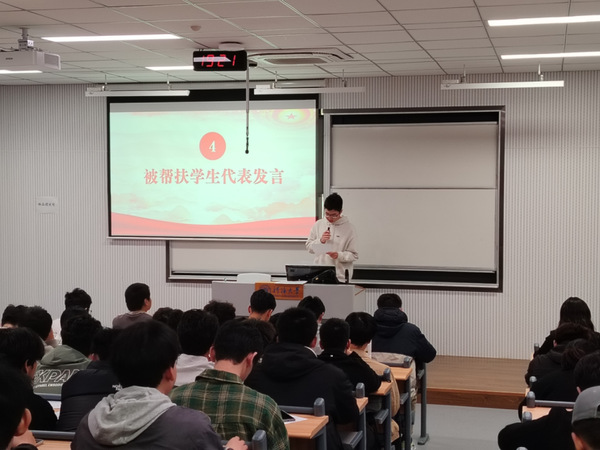 接下来,研究生帮扶代表2024级结构工程专业研究生王钧乐同学上台发言,他指出要在学习中互帮互助才能行稳致远。此外,他还鼓励同学们在帮扶联动中保持进取的态度,敢于发言,勤于提问,在相互学习中实现自我提升。