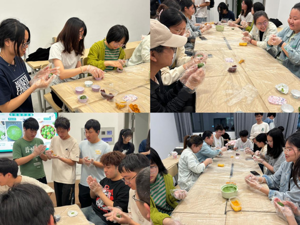 随后,活动进入到了同学们动手制作青团的环节。桌上摆满了制作青团所需的材料:青团皮、豆沙馅等。在志愿者的指导下,同学们纷纷开始了青团的制作。在主持人的鼓励下,同学们给青团设计了不同的造型以及不同的装饰。