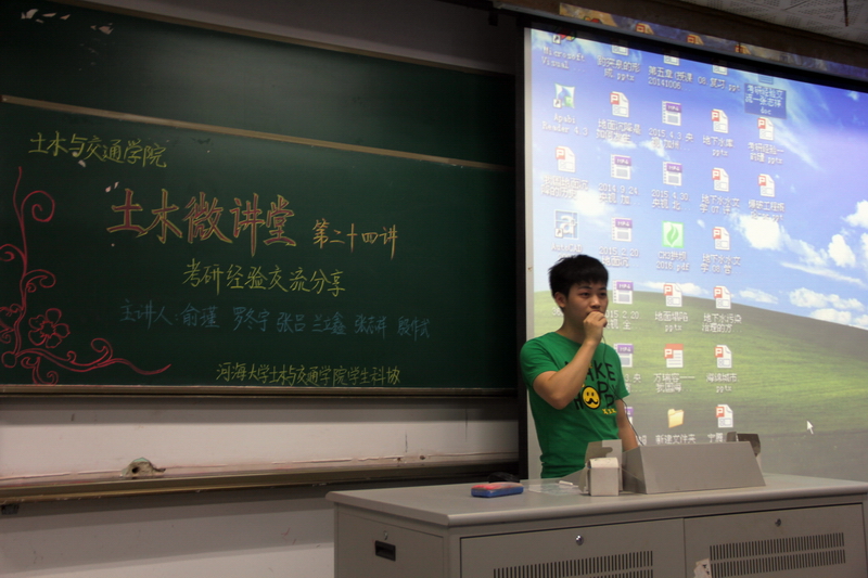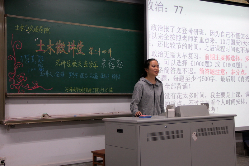 2016年5月30日晚上6:30,土木与交通学院“土木微讲堂”第二十四讲之“考研经验交流分享”在本部管理楼101成功举办。本次微讲堂邀请了2012级土木专业张吕、张志祥、俞瑾、殷作武与交通专业罗冬宇、兰立鑫六位同学作为主讲人,为学院同学们分享自己考研准备过程中的经验。