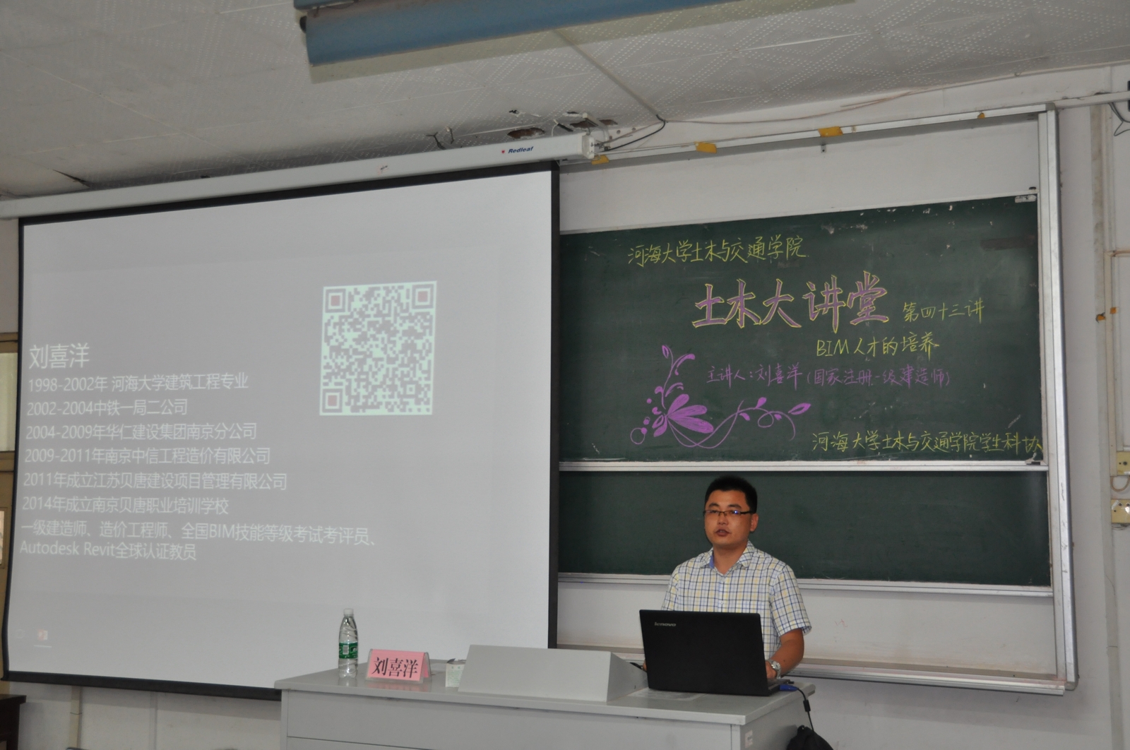 2016年6月22日上午10:00,由土木与交通学院学生科协承办的“土木大讲堂”第四十三讲之“BIM人才的培养”在本部北教102成功举办。本次讲座有幸邀请到了河海大学土木专业98级校友、南京贝唐职业培训学校副校长,国家注册一级建造师刘喜洋老师主讲人。土木与交通学院蒋勇老师以及2013级辅导员丁小庆以及学院2013级本科生出席了本次讲座。