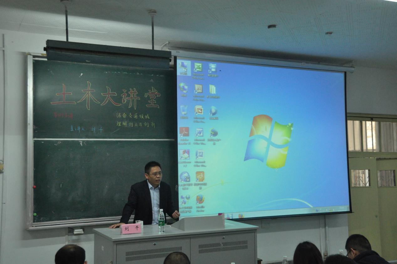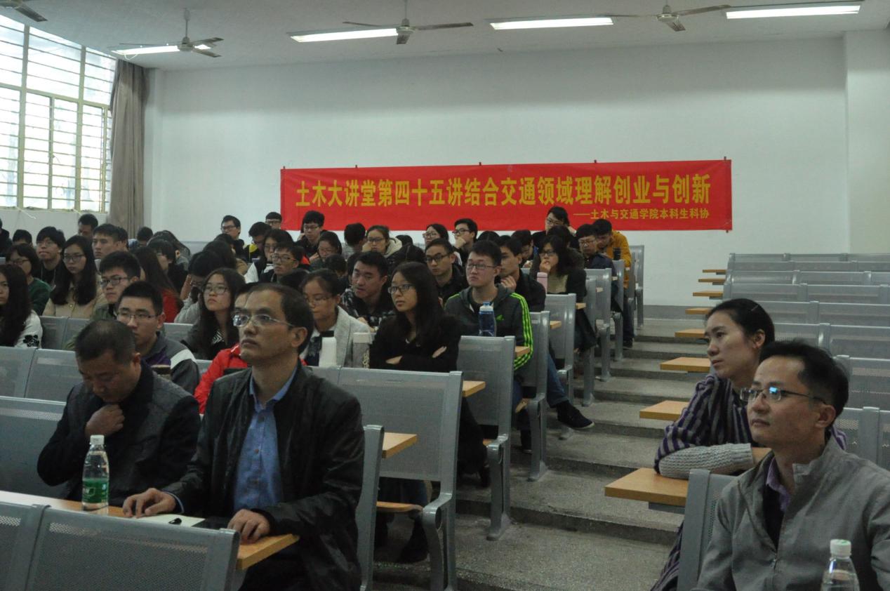 2016年11月1日,由土木与交通学院主办,土木与交通学院本科生科协承办的“土木大讲堂”之第四十五讲“结合交通领域理解创业与创新”在我校西康路校区北教104成功举行。本次大讲堂,学院邀请到了南京赛康交通安全科技股份有限公司董事长,高级工程师,南京林业大学兼职教授刘干作为主讲人。土木与交通学院交通系郑长江主任、刘云副主任、2014级辅导员张洁老师以及土木院2013级、2014级交通工程本科生聆听了本次讲座。