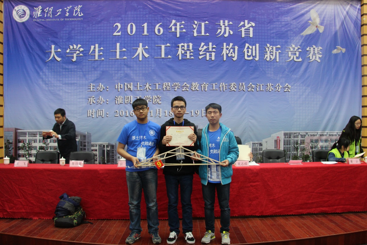 2016年11月18日至19日,2016年江苏省大学生土木工程结构创新竞赛在淮阴工学院举行。我院参赛同学在学院精心组织和多位指导教师和高年级学长的辛勤辅导下,发挥出色,获得二等奖2项,三等奖1项。