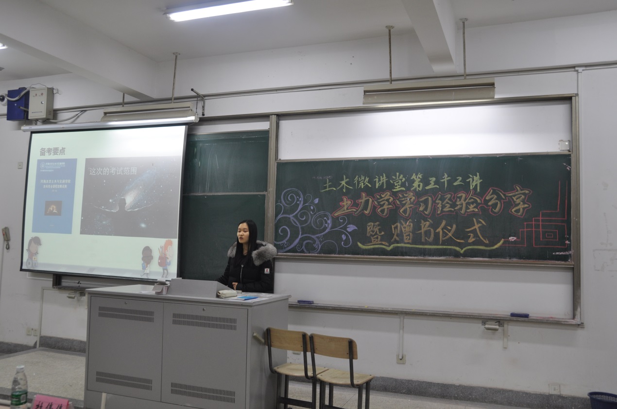 第二位主讲人为沈雪同学。首先她向同学们介绍了土力学试卷的语言类型,鼓励同学们尝试用英文补充答题。她还建议同学们要理解记忆公式,来提高解题效率。之后她以往年试卷为例,为大家具体分析了每种题型的特点,传授给同学们独特的解题技巧。最后,她向同学们强调了土力学在土木工程专业领域的重要性,告诫大家一定重视土力学,并预祝同学们在期末考试中取得好的成绩。