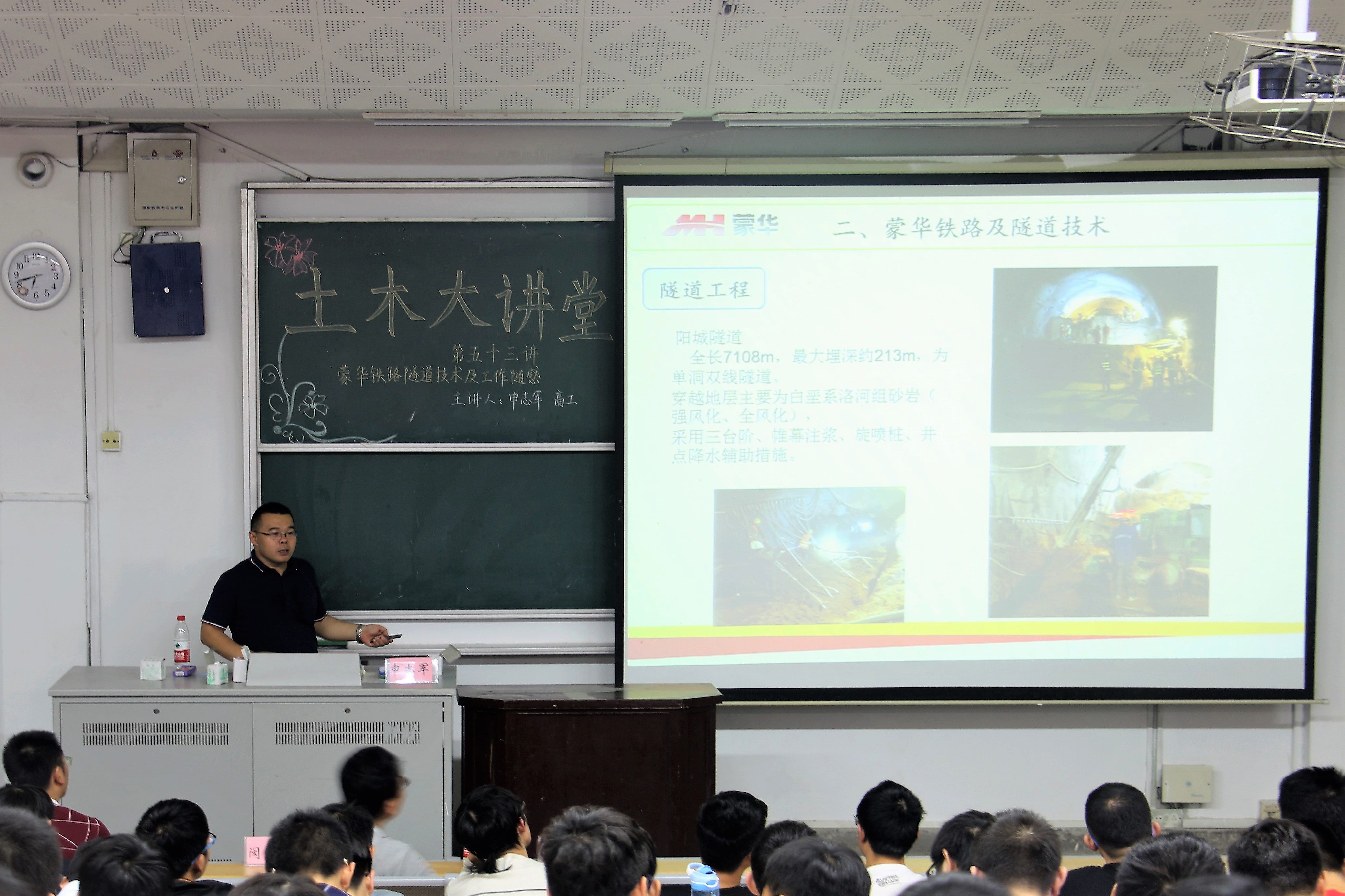 首先,申志军高工运用图片、案例向同学们简单介绍了隧道施工过程。接着,申高工从蒙华铁路建设中的洞口施工、隧道开挖、初期护理以及监控测量等方面向同学们讲诉了隧道施工的完整过程,让同学们对隧道施工过程有了清晰准确的认识。同时申高工重点讲解了蒙华铁路工程施工过程中的技术难题以及相应的解决方法,介绍了此次工程的关键环节以及理论和技术方面的创新,让同学们对隧道技术的发展有了全新的认识。最后,申高工结合自己的工作经历向同学们分享了自己参与此次工程的随感,希望同学们要在艰难困苦中发现快乐,拼搏奋斗的同时享受生活。