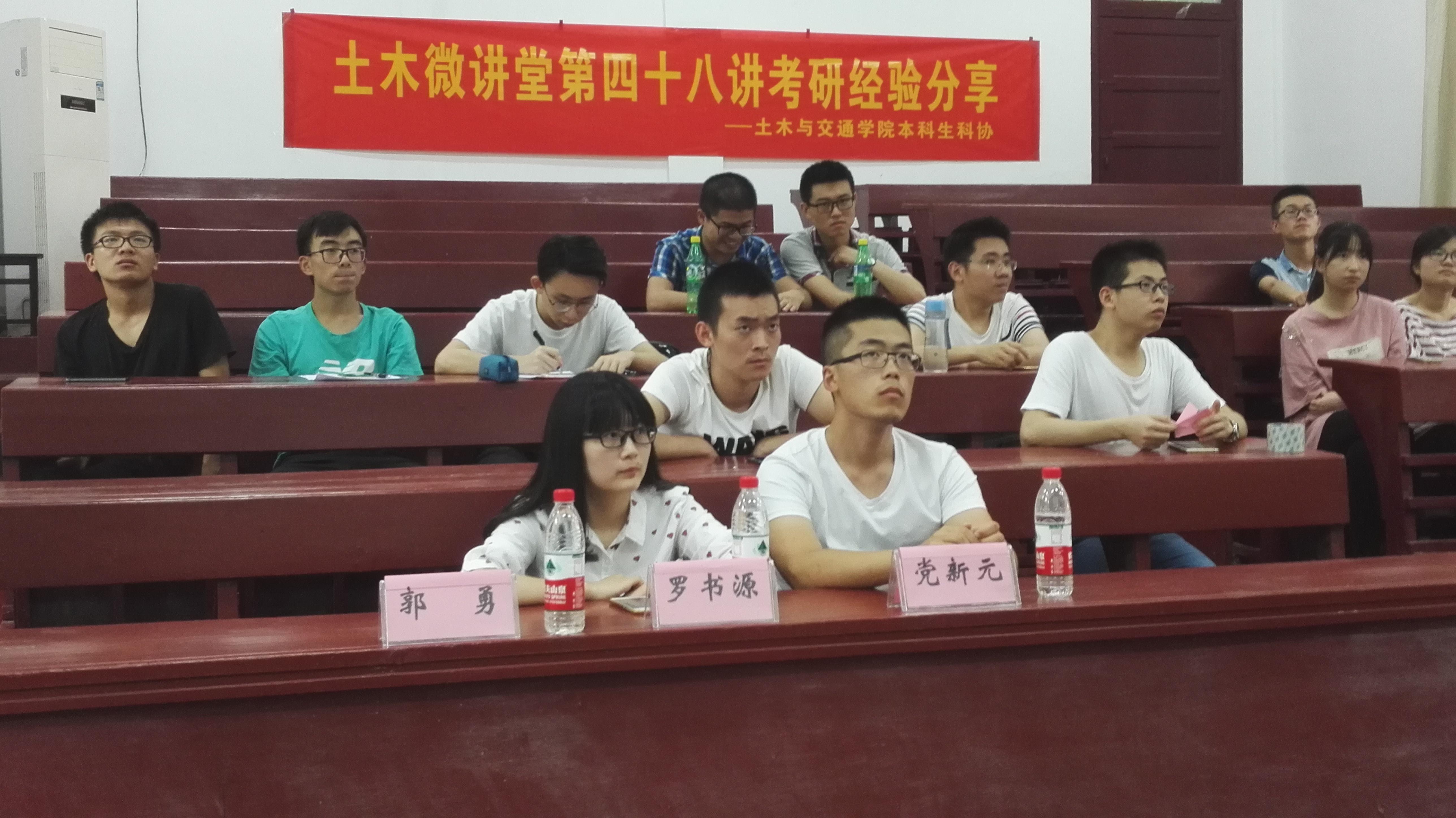 2017年6月21日中午12点30分,土木与交通学院土木微讲堂第四十八讲之“考研经验分享”在我校本部工程馆101成功举办。本次微讲堂邀请到了13级土木工程本科生郭勇、党新元,13级交通工程本科生罗书源三位同学作为主讲人,为同学们分享他们考研的经验。