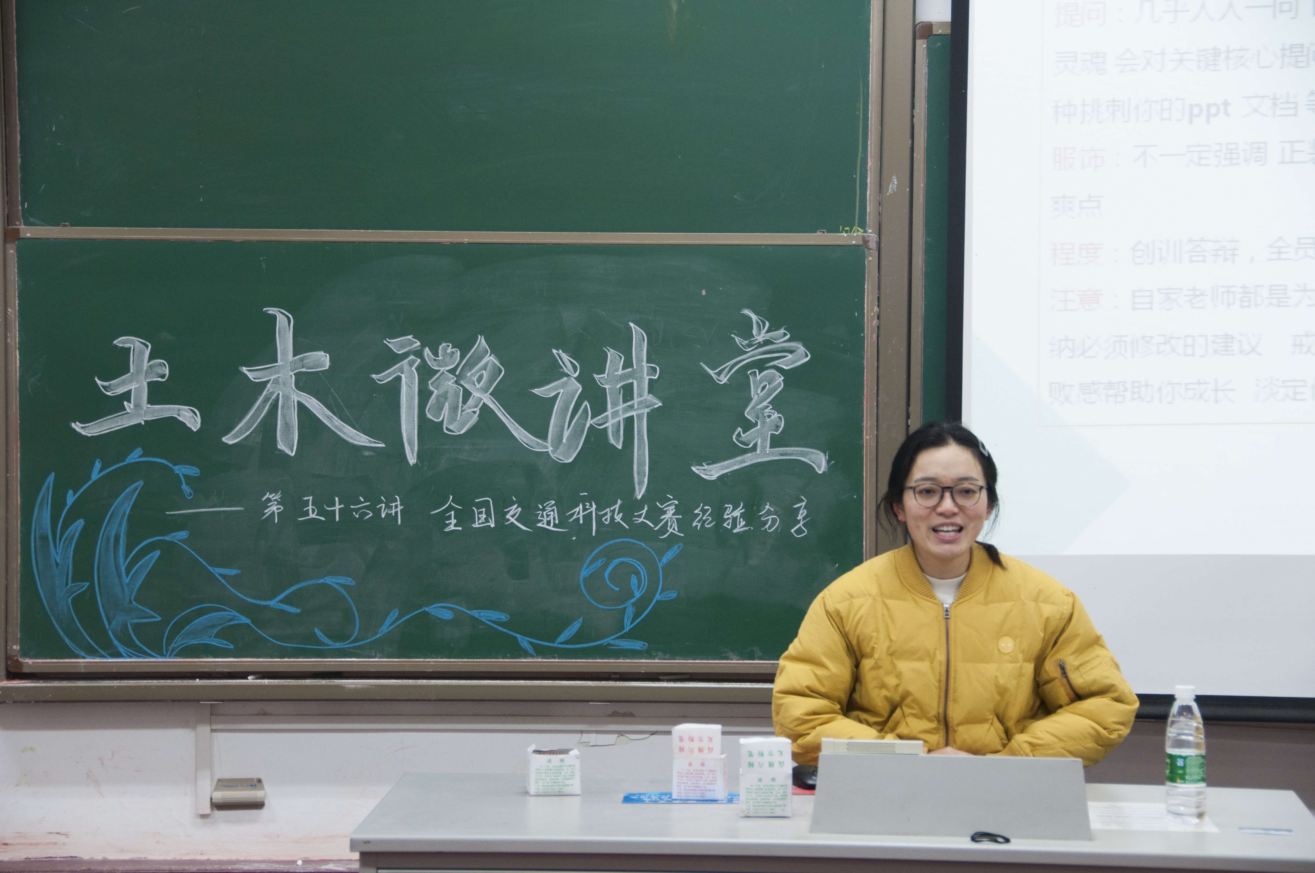 2018年1月6日下午3:50,由土木与交通学院主办,学院本科生科协承办的土木微讲堂第五十六讲之“全国交通科技大赛经验分享”在校本部工程馆101室成功举办。本次讲座邀请到了2014级优秀学生钱文雯、吴季恒、谭和清和林初染四位同学担任主讲人,四位同学来自同一个队伍已经参加并获得了全国交通科技大赛一等奖的优异成绩,对交通科技大赛的备赛、参赛情况有着丰富的经验。土木院2015级的部分同学聆听了本次讲座。