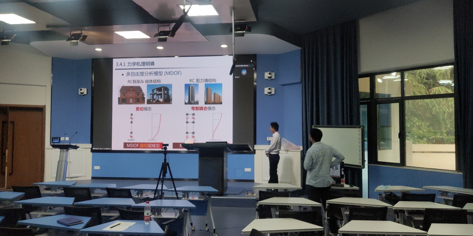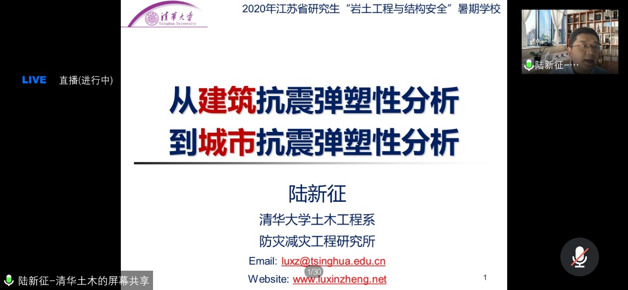 下午第一场报告的主讲人是清华大学土木工程系陆新征教授,他作了题为《从建筑抗震弹塑性分析到城市抗震弹塑性分析》的线上报告,由我国地震灾害研究背景介绍到重大工程和大型城市面临的抗震防灾问题。陆教授以北京市“中国尊”这一建筑为例,向同学们讲述了建筑抗震弹塑性分析的建模方法、验证手段和建筑破坏失效准则,并对城市抗震弹塑性分析的背景历史和优点进行了详细的介绍。陆教授也与老师们就建模和数据提取问题进行了热烈的交流,并对地震灾害损伤及评估的研究进行了展望,鼓励同学们好好努力,为土木工程防灾减灾方面的研究做出自己的一份贡献,同学们被陆教授的激励所鼓舞,用热烈的掌声感谢陆教授精彩的汇报。