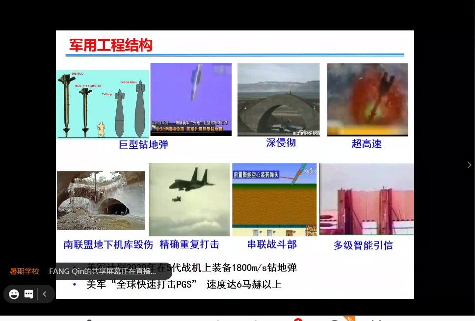 上午的首场授课专家是中国人民解放军陆军工程大学副校长方秦教授,他的授课题目是《军用和民用工程结构抗冲击爆炸》。方秦教授首先给大家科普了军事打击中的侵彻现象与机理,然后介绍了其在民用工程结构抗撞击和抗爆炸等方面的工作,包括建(构)筑物抗恐怖爆炸袭击及防护、核电站结构抗大型客机撞击及防护、爆炸荷载特性及抗爆结构设计计算方法等几个专题。最后着重介绍了冲击爆炸数值模拟中的混凝土类材料模型现状和研究进展。方教授在讲课时深入浅出、娓娓道来,增加了同学们对工程结构抗爆炸与抗冲击的认识,提高了同学们对国防学习的热情。针对学员们提出的高应力状态下混凝土怎么选择本构模型、将钢板等金属材料添加到混凝土结构中会有什么优缺点等专业问题,方秦教授给出的解答言简意赅、平易近人,相信同学们在这次教学中受益匪浅!