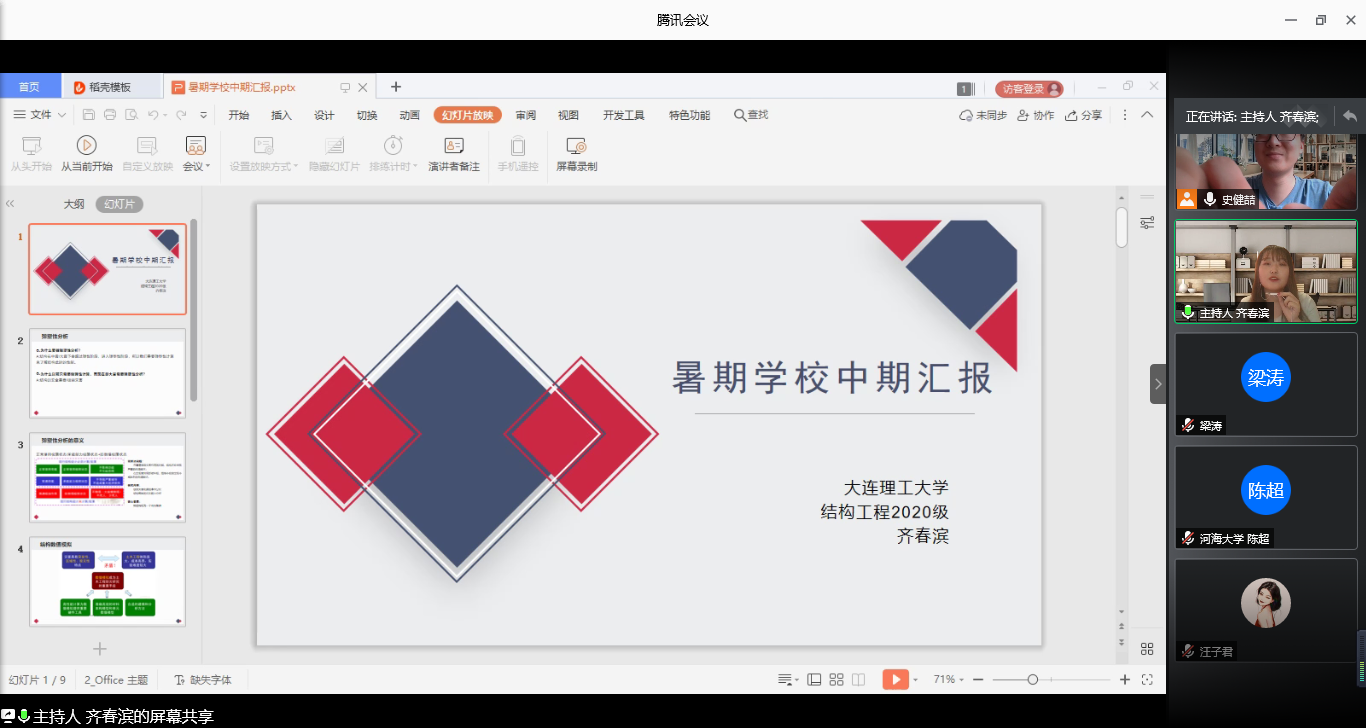 8月15日是2020年江苏省研究生“岩土工程与结构安全”暑期学校的第六天。今天是本次暑期学校专项活动“学员交流日”,经过连续四天的学术大餐,学员们在学海畅游、丰富自身的同时,也结识了各路志同道合的好友,本着“以文载道,以学会友”的精神,今日将舞台交给学员,在四个会场、共16场会议中,学员们纷纷上台进行了PPT汇报,踊跃发言,或是介绍自己的研究课题,或是分享自己的学习心得,或是介绍自己的学校专业等,大家进行了丰富多样的讨论,学员之间有了更进一步的了解。