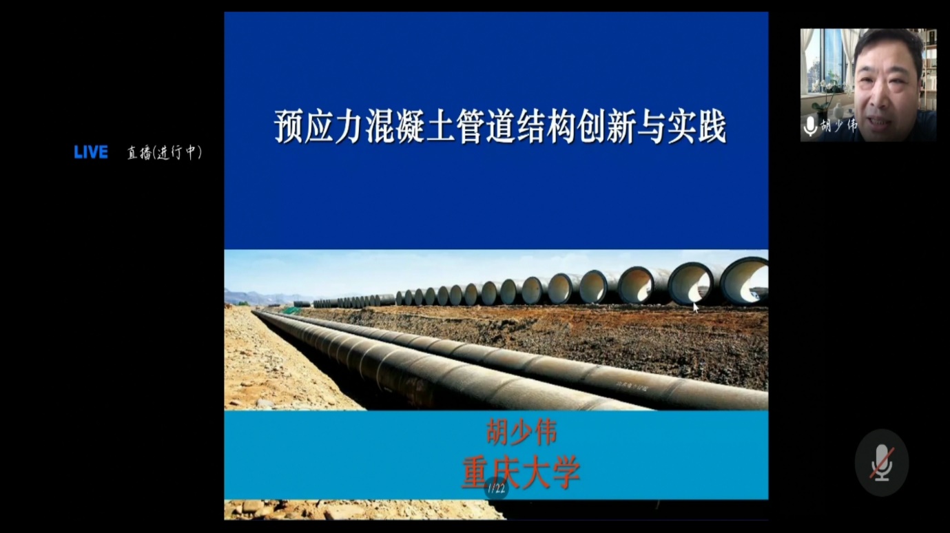 上午第二场学术报告的主讲人是重庆大学土木工程学院胡少伟教授,他的授课题目是《预应力混凝土管道结构创新与实践》。胡教授从预应力混凝土管道结构的国内外应用情况触发,介绍了超大口径PCCP管道结构安全与质量控制研究的最新进展,并展示了一种新型产品——钢筋缠绕钢桶混凝土压力管(BCCP)的结构理论、设计与试验研究成果,对预应力混凝土管道研究现状提出了几点思考并展望了下一步的工作。胡少伟教授的讲解大大的开阔了学员们的视野,勾起了学员们浓厚的兴趣。