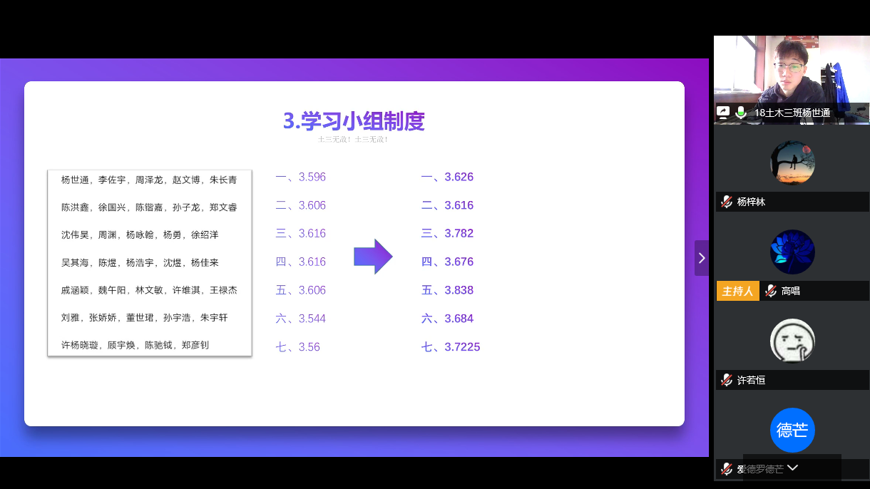 答辩正式开始,各班答辩人按照顺序依次对班级学风现状、创建计划以及预期目标和效果进行了阐述,各班从思想政治素质培养、学风建设、文明建设、制度建设四个方面详细介绍了班级的创建计划,有的班级还对疫情期间线上学习相应的督促机制和帮扶措施进行了分享。