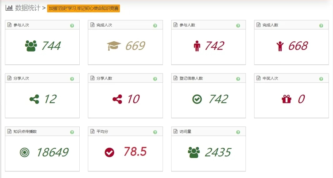 本次知识竞答考察范围为党史、新中国史、改革开放史、社会主义发展史,面向对象为全体土木与交通学院师生,师生参与达744人次。