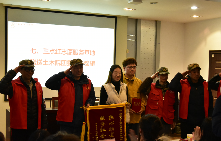 接着,三点红志愿服务基地参会老兵为土木与交通学院团委青协赠送锦旗并为志愿者代表颁发证书。