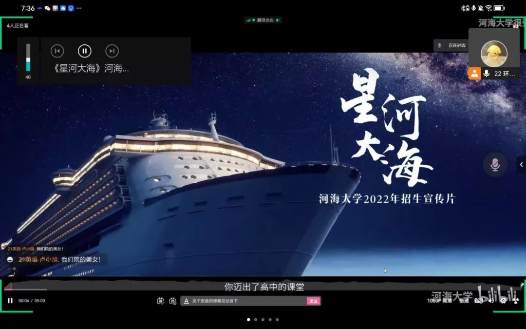 队长祝晨阳从历史、专业介绍、就业率、河海特质、校园文化活动、国际交流等方面对河海大学进行了简单的介绍,并为同学们播放宣传视频。团队其他成员分别向同学们介绍了自己所学专业的相关内容,最后由队长祝晨阳总结,表达了对同学们的祝愿并鼓励同学们报考河海大学。