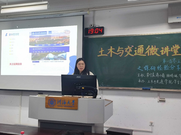 2023年3月17日19:00,由土木与交通学院主办,学院本科生学生会承办的土木与交通微讲堂第一百零五讲之“保研经验分享”于河海大学西康路校区工程馆207成功举办。本次微讲堂有幸邀请到土木与交通学院2019级土木工程专业本科生薛小萌、杨梓林、2019级交通工程专业本科生梁宁晨、华翊璇担任主讲人,土木与交通学院2020级部分学生聆听了本次讲座。