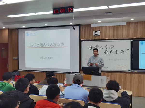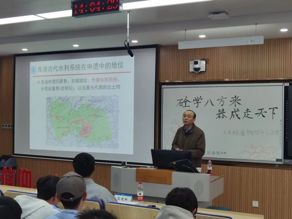 随后,袁教授向同学们详细介绍了“良渚水坝”的建筑构造和建筑原理,以此向同学们普及了相关的专业知识。在讲解过程中,袁教授注重将理论与实际相结合,通过一张张生动的图片,同学们在袁教授的讲解中,对“良渚水坝”以及相关建筑的知识有了更加深刻的认识。