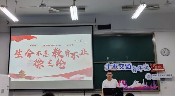 然后,主讲人曾慧程讲述了徐芝纶的的红色事迹。徐芝纶是我国科学院院士,也是力学界的一代宗师,曾参与创办了华东水利学院(今河海大学)。徐芝纶院士一生学无止境、教无止境,在科研和教学方面成绩斐然。在科研方面他积极推动有限元法在中国工程实践中的普及与推广;在教学方面他致力于教材编著,曾带出多批优秀学生,并设立了徐芝纶奖学金以鼓励、帮助学生。